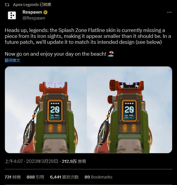 此次也並不例外,不過這一次武器機瞄的優勢並非是因為設計原因,而是因為 BUG 所導致的。在工作室官方推特上,重生表示:“Splash Zone 平行步槍面板目前缺少一部分機瞄,使其看起來比應有的要小。在未來的補丁中,我們將對其進行更新以匹配其預期設計。”
