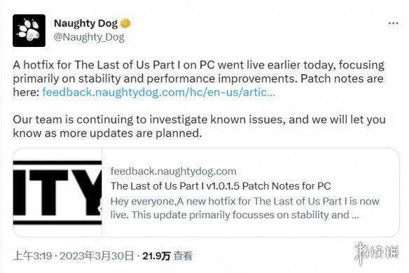 《最後生還者重製版》PC版因為優化太爛,目前在Steam的評價為“多半差評”,好評率僅有35%,頑皮狗已承認PC版存在問題,並承諾將盡快解決。今天《最後生還者重製版》PC版迎來了首個熱修補丁。