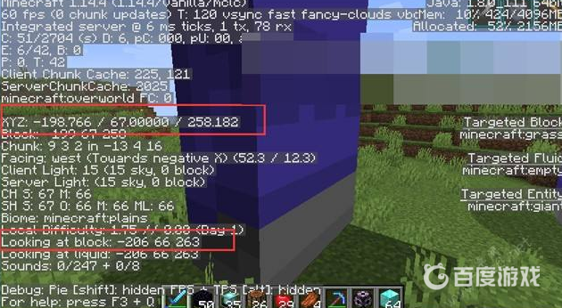 2、然後在遊戲中按下F3後,就可以在介面上顯示出包含玩家座標的所有遊戲資訊,左側[XYZ]顯示的是玩家所在的座標,下方[looking at block]顯示的玩家滑鼠指向的位置座標。