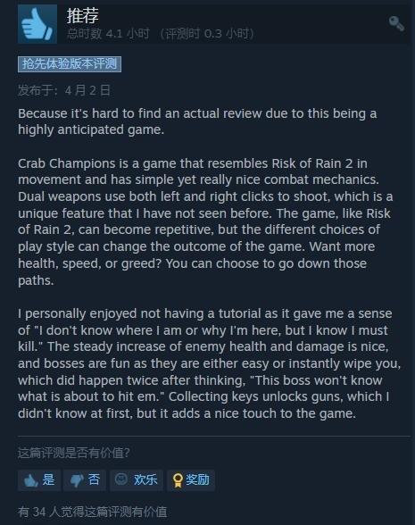 肉鴿射擊遊戲《Crab Champions(螃蟹冠軍)》已於4月2日登陸Steam平臺,目前為搶先體驗,遊戲評價方面為好評如潮,截止發稿時共有1529篇評測,有高達98%的好評率,僅有27篇差評。