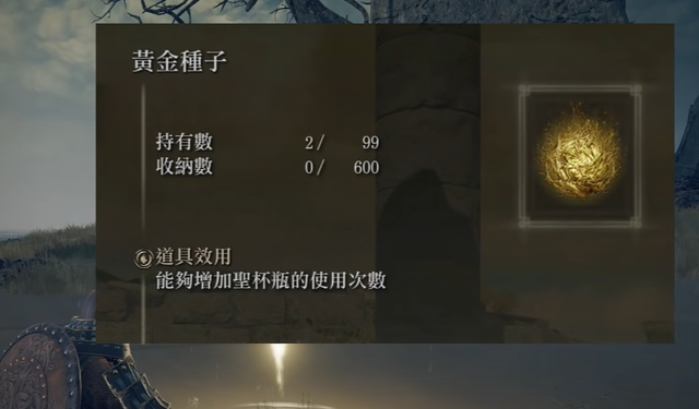 1、黃金種子:作用類似於前作的「元素碎片」,可以增加果粒橙(血瓶)和脈動(藍瓶)的使用次數,但本作和《只狼》一樣,葯瓶每次升級需要花費的種子數量是逐漸增加的,因此這個遺物也許沒有你想像的那麼關鍵。