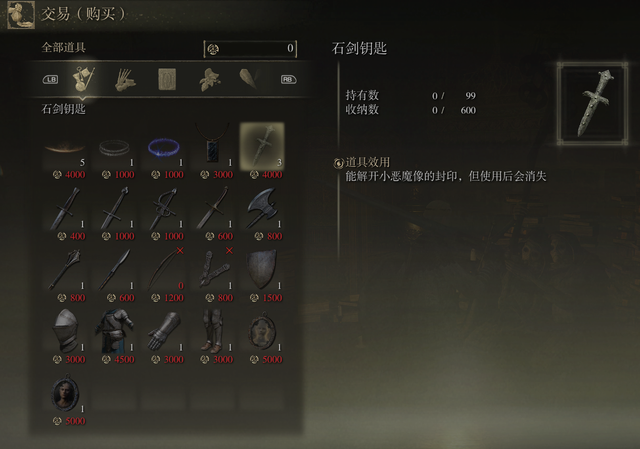 2、石劍鑰匙:開啟小惡魔封印的消耗品,開場CG過完後就會出現流程第一個被封印的地牢,裡面有非常牛X的逃課物品「黃金樹的恩惠」,裝備後可增加血量、精力和負重的上限,一旦入手可以大幅降低開荒難度。不過這玩意的獲取難度取決於玩家的跑酷技巧。