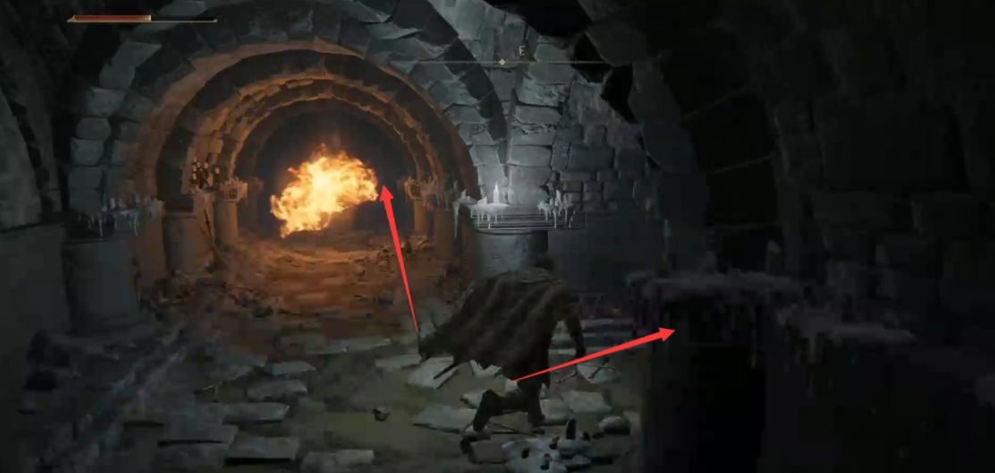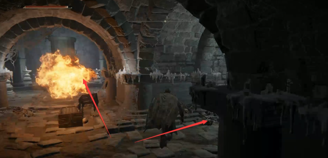 5、趁噴火間隙跑過來,右拐可以躲一下。先別離開,繼續找間隙可以抵達噴火機關處,敲打一下噴火機關,火焰就會停止。噴火機關後面拿到喚聲泥顱「你好」。