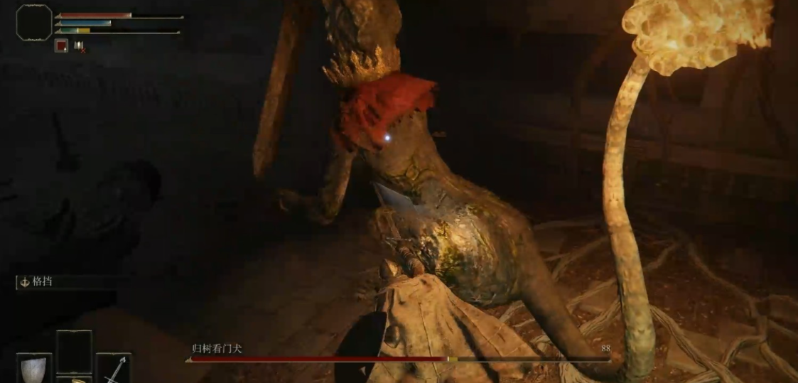 9、歸樹看門犬的攻擊比較頻繁,尋找短暫的攻擊間隔上去砍它。它的大砍刀很猛,盡量不要和它面對面。