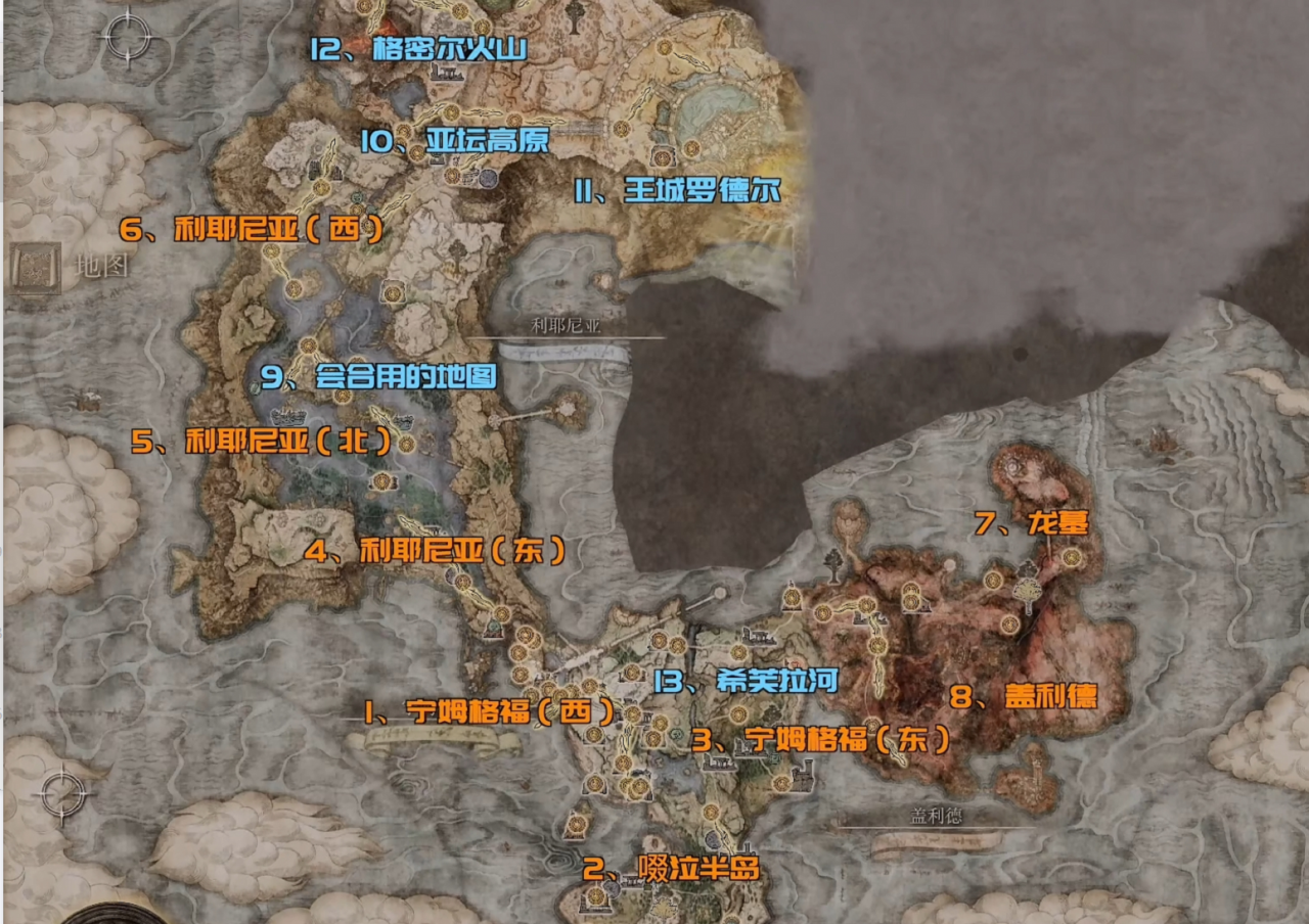 首頁 艾爾登法環 問答 艾爾登法環地圖順序是什麼? 2022-07-01 第一,寧母格福(西)第二,啜泣半島第三,寧母格福(東)第四,利耶妮亞(東)第五,利耶妮亞(北)第六,利耶妮亞(西)第七,龍墓第八,蓋立德第九,會合用的地圖第十,亞壇高原第十一,王城羅德爾第十二,格密爾火山第十三,希芙拉河