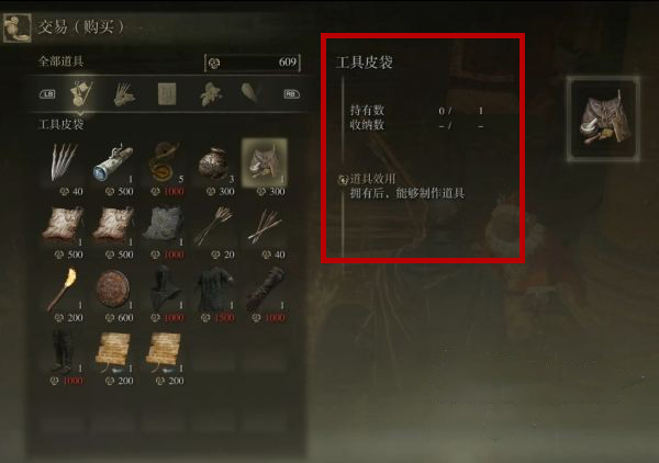 首頁 艾爾登法環 問答 艾爾登法環怎麼製作? 2022-07-01 1.首先與艾雷教堂的商人對話,他推薦你買工具皮袋,如圖下所示。2.擁有工具皮袋即可解鎖「製作道具」菜單,能用材料製作各種道具,如圖下所示。