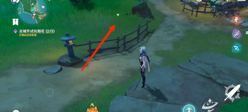2、接著去城外放煙花,傳送到城外,跟隨地圖指示在這個石頭上就可以放煙花,還有邊上的石頭和草地總共三個地方。試玩後再返回稻妻城內告訴長野長野原龍之介你的感受,選擇下次還想玩即可完成任務。