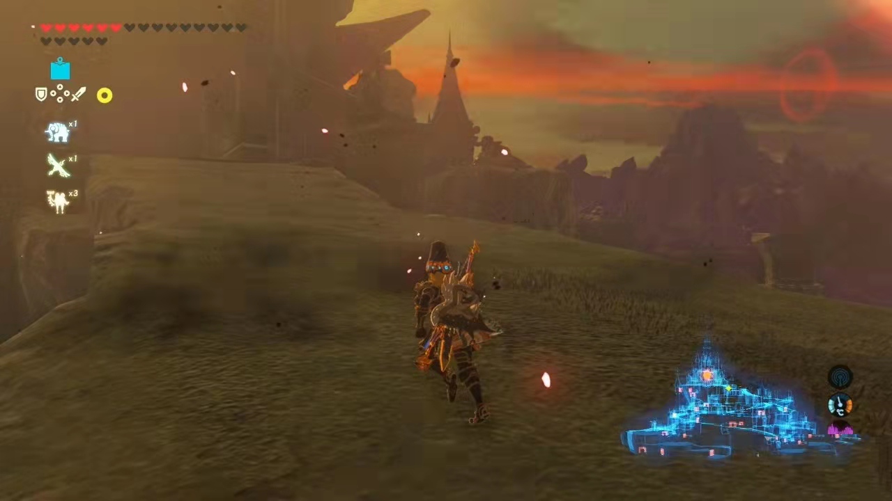 前往最終BOSS戰前需要準備一些道具,除了最基本的料理和藥品外,最重要的是前往地圖右上角的卡萊研究生兌換一個古代之盾,這個盾只要按住防禦,就可以直接彈反古代兵器的激光。材料則需要擊殺有腿的古代兵器或者飛行的古代兵器獲得。準備完畢後,進入海拉魯城堡,進入之後就會觸發劇情。