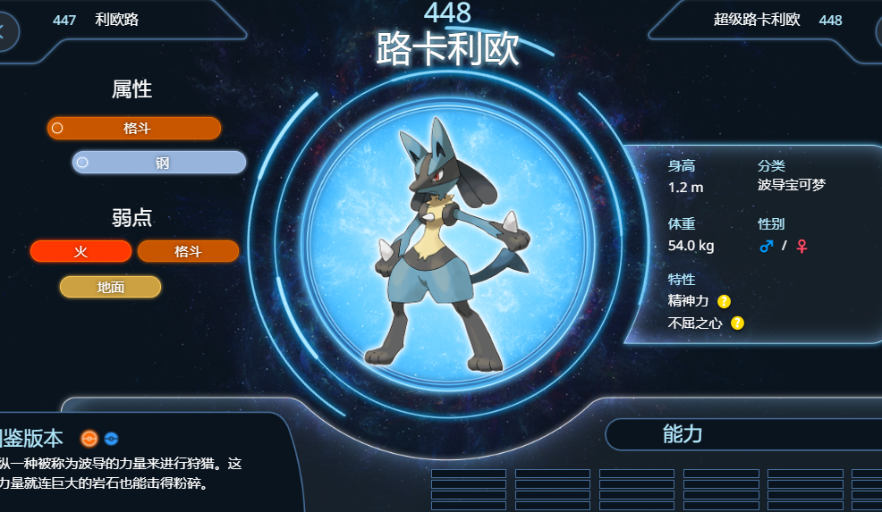 4、望羅隊伍第四隻是風速狗,玩家可以使用【路卡利歐】去打,如下圖所示,路卡利歐是格鬥與鋼屬性的寶可夢,特性是精神力和不屈之心,可直接使用招式近身戰去打對方。