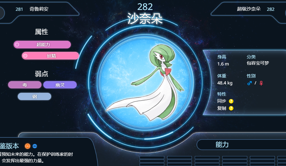 3、望羅隊伍第三和第四隻寶可夢分別是烈咬陸鯊和羅絲雷朵,玩家可以使用【沙奈朵】去打,如下圖所示,沙奈朵是超能力與妖精屬性的寶可夢,特性是同步與復制,可以使用招式月亮之力秒殺對方。