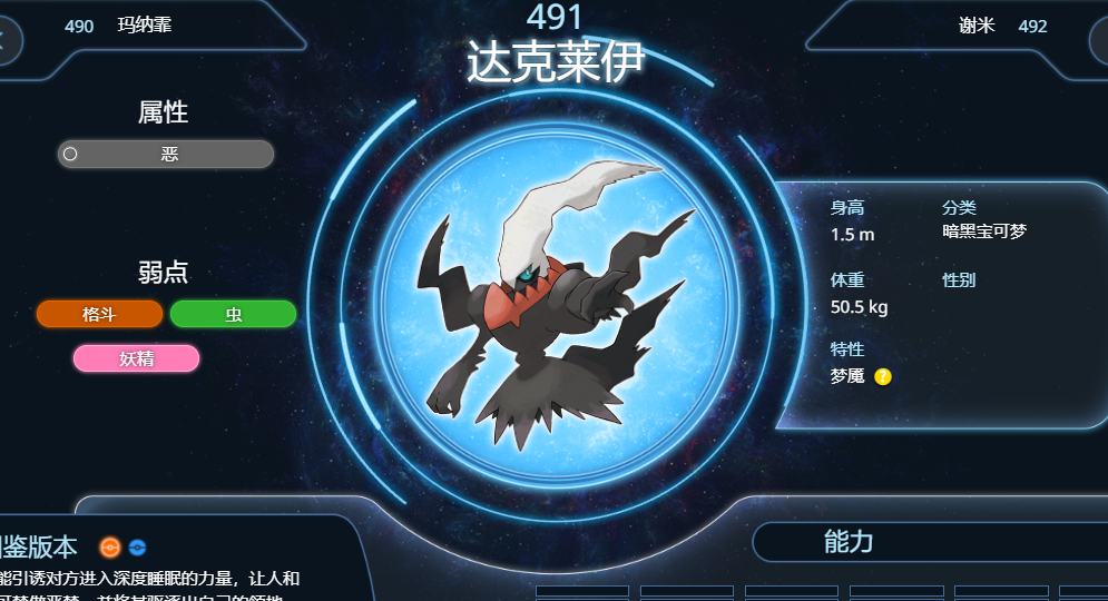 1、望羅隊伍第一隻寶可夢是花岩怪,玩家可以使用【達克萊伊】去打,如下圖所示,達克萊伊是惡屬性寶可夢,特性是夢魘,直接使用黑洞加禍不單行帶走對手。