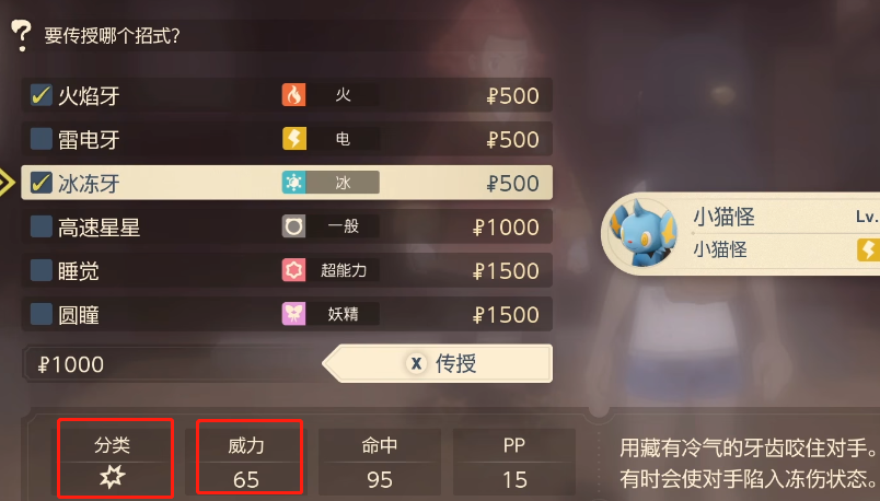 二、如下圖所示,冰凍牙分類為攻擊型招式,基礎為例65,攻擊(物攻)提升能提升傷害。