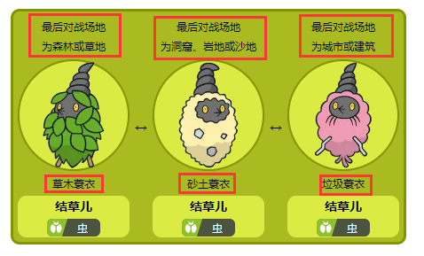 在寶可夢阿爾宙斯中,結草兒擁有的三種形態分別是草木蓑衣、砂土蓑衣和垃圾蓑衣,如下圖所示,當最後對戰場地是森林或草地時,可獲得草木蓑衣形態的結草兒;當最後對戰場地時洞窟、沙地或者岩地時,可獲得砂土蓑衣形態的結草兒;當最後對戰場地是建築或城市時,可獲得垃圾蓑衣形態的結草兒。