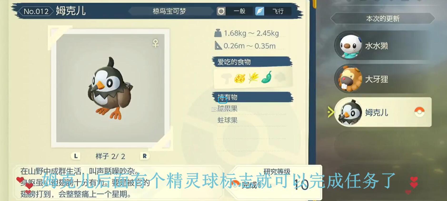 2.姆克兒的圖鑒課題分為五種:分別是捕獲的次數、未被察覺就捕獲的次數、打倒的次數 、已確認到的樣子的種類數、讓它進化的次數;