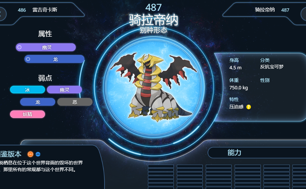 5、騎拉帝納是一隻幽靈與龍屬性的寶可夢,如下圖所示,弱點是冰、幽靈、龍、惡與妖精屬性,特性是壓迫感。