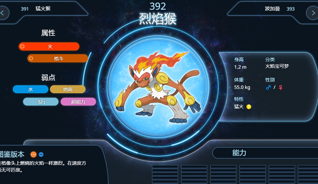 4、烈焰猴是一隻火屬性與格鬥屬性的寶可夢,如下圖所示,弱點是水、地面、飛行和超能力屬性,特性是猛火。