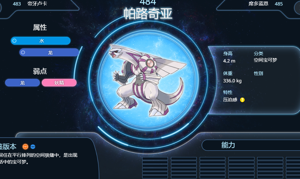 3、帕路奇亞是一隻水屬性與龍屬性的寶可夢,如下圖所示,弱點是龍與妖精屬性,特性是壓迫感。