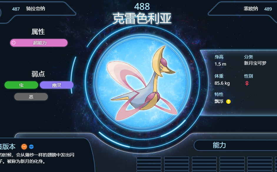 2、克雷色利亞是一隻超能力屬性的寶可夢,如下圖所示,弱點是蟲、幽靈與惡屬性,特性是漂浮。