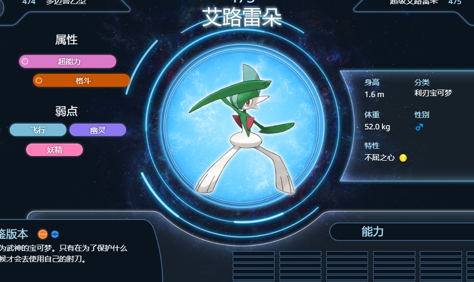 1、在寶可夢阿爾宙斯中,二周目推薦陣容是:艾路雷朵、克雷色利亞、帕路奇亞、烈焰猴、騎拉帝納和烈咬陸鯊。如下圖所示,艾路雷朵是一隻超能力與格鬥屬性的寶可夢,特性是不屈之心。