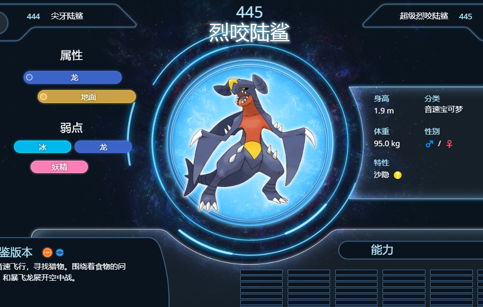 6、烈咬陸鯊是一隻龍與地面屬性的寶可夢,如下圖所示,弱點是冰、龍和妖精屬性,特性是沙隱。