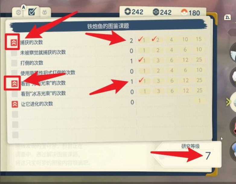 2、進入圖鑒後,查看一個寶可夢的圖鑒課題,可以看到圖中的研究等級是7,這是怎麼算的呢?首先左側界面,前面有紅色標誌的,研究等級乘以2,沒有的就不用翻倍,這麼一算就是(2*2) 1 (1*2)=7。