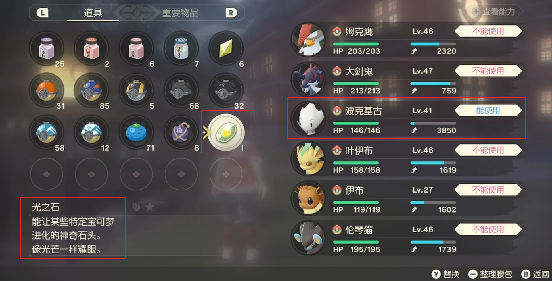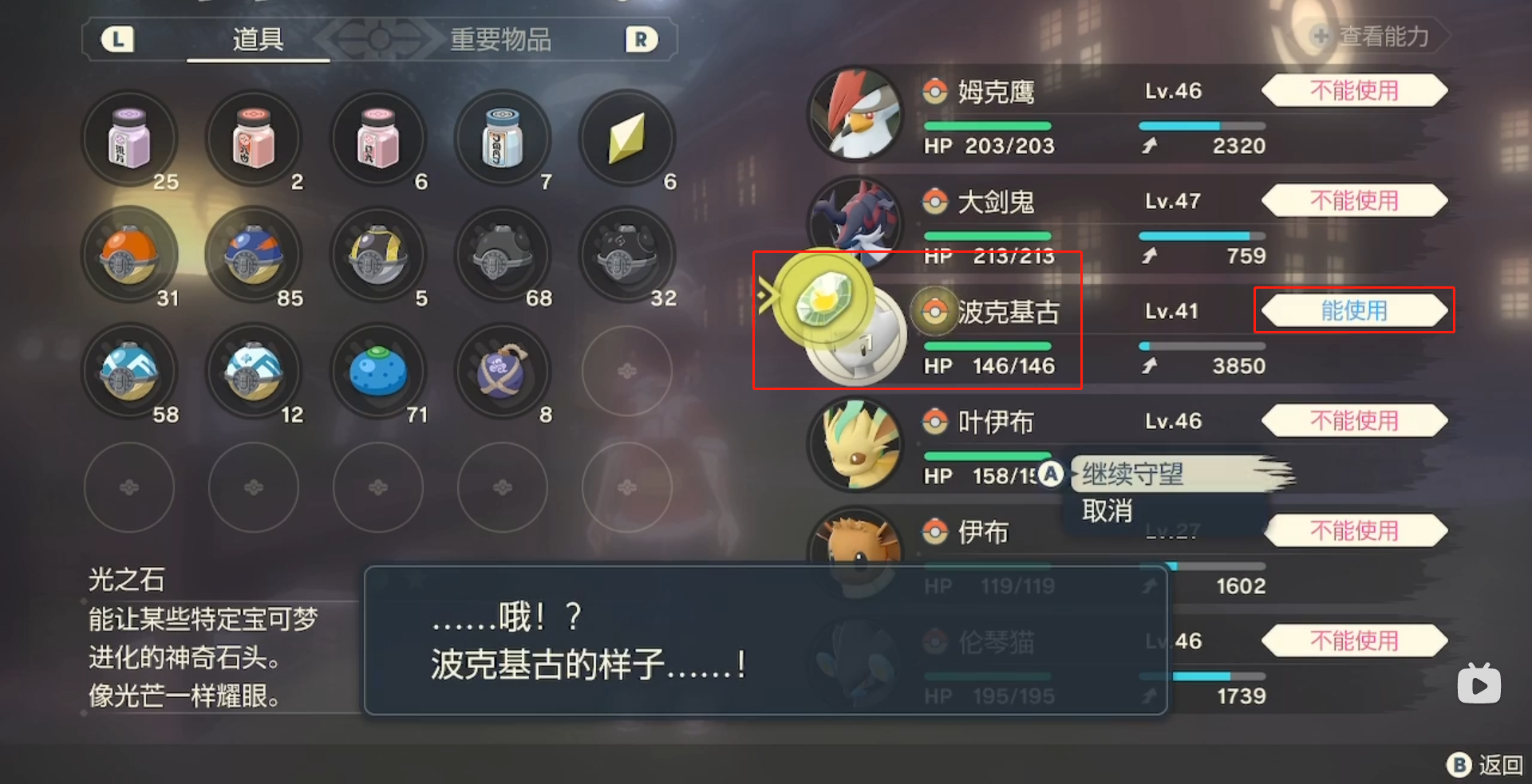 波克基斯是波克基古使用光之石以後進化而來。有些特殊的寶可夢就是需要對應的屬性石來達成進化,如下圖,選擇了光之石後,波克基古會顯示「能使用」,而其它的寶可夢則顯示不能使用。