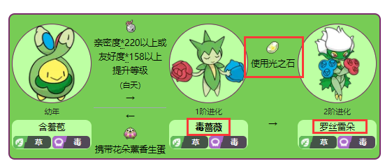 首頁 寶可夢傳說:阿爾宙斯 問答 寶可夢阿爾宙斯毒薔薇怎麼進化? 2022-07-08 在寶可夢阿爾宙斯傳說中,毒薔薇需要使用道具【光之石】後,才可進化成為【羅絲雷朵】,進化後的羅絲雷朵是一隻草屬性與毒屬性的寶可夢。
