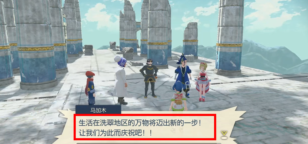 《寶可夢傳說:阿爾宙斯》一周目結局是眾人齊心協力保護洗翠地區,主角打敗了在神殿大鬧的帝牙盧卡,最後大家一起慶祝勝利。