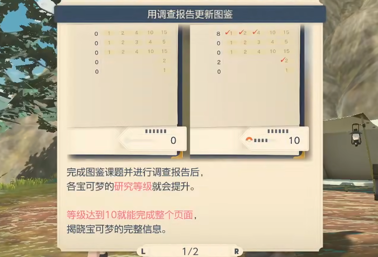 1、玩家完成圖鑒課題並進行調查報告後,各寶可夢的研究等級就會提升,等級達到十就能完成整個頁面,揭曉寶可夢的完整信息。