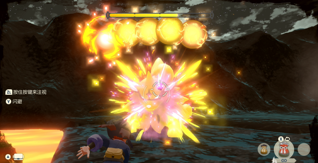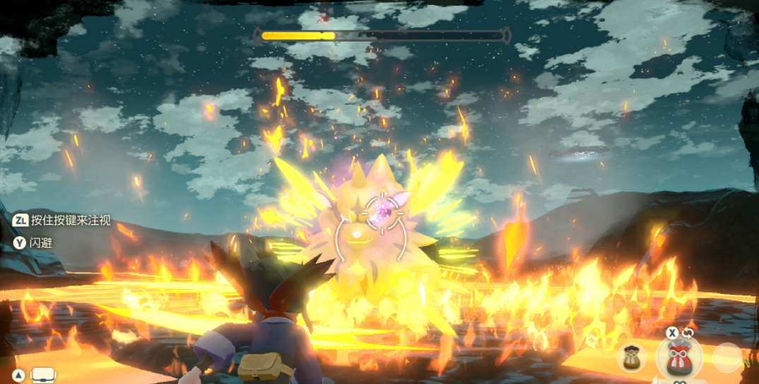 5、由於地形原因受到了極大的限制,要學會閃避躲過技能攻擊,風速狗頭上出現火球,我們可以靠近使用投鎮寶消除火球數量。當風速狗頭上出現火球全部被消滅,那麼風速狗進入眩暈狀態,這時候我們使用寶可夢對戰。