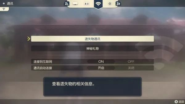 1.打開背包會看到屏幕上方一個類似WIFI的圖標,按ZL或ZR移動到圖標上,屏幕上就會顯有遺失物通訊這個功能了