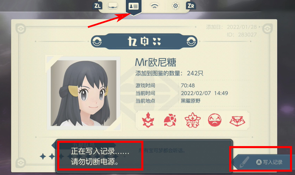 1、玩家先打開背包,然後切換至個人信息頁面,按A【寫入記錄】,保存當前進度。