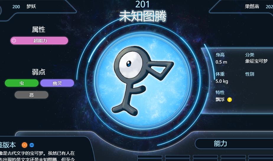 1、在傳說阿爾宙斯中,未知圖騰是一隻超能力屬性的寶可夢,擁有漂浮的特性,自身的弱點是蟲屬性、幽靈屬性和惡屬性。
