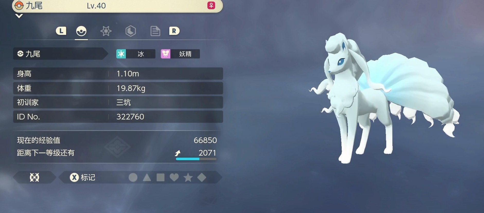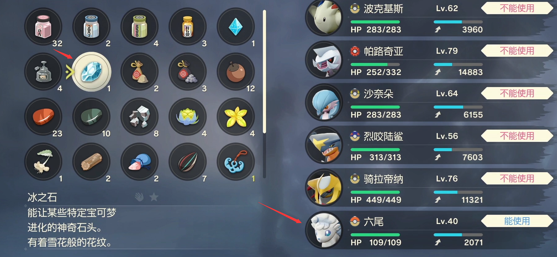 首頁 寶可夢傳說:阿爾宙斯 問答 阿爾宙斯冰九尾怎麼進化? 2022-07-11 1、阿爾宙斯冰九尾是由冰六尾進化的,首先我們來到冰岩邊進行進化,2、然後打開腰包,找到道具,冰之石,並對六尾使用,3、這樣冰九尾就進化完成了,冰九尾是鎖閃的。4、冰九尾的具體屬性如下圖所示: