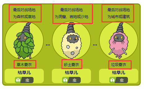 首頁 寶可夢傳說:阿爾宙斯 問答 寶可夢傳說:阿爾宙斯結草兒三個形態怎麼獲得? 2022-07-12 在阿爾宙斯中,結草兒一共有三種形態,如下圖所示,當最後對戰場地為森林或草地時,即可擁有「草木蓑衣」形態;當最後對戰場地為洞窟、岩地或沙地時,可獲得「砂土蓑衣」形態;當最後對戰場地為城市或建築時,可獲得「垃圾蓑衣」形態。