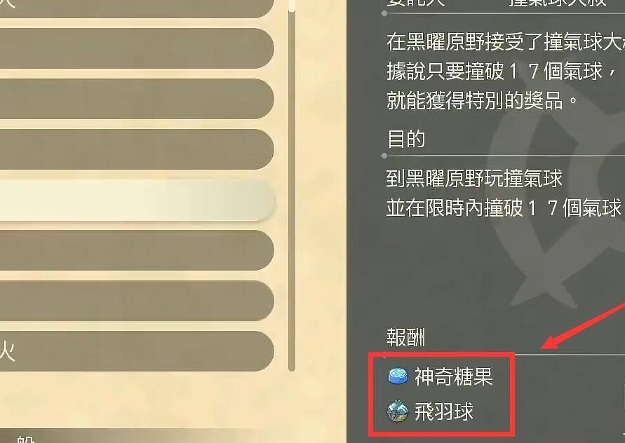 首頁 寶可夢傳說:阿爾宙斯 問答 阿爾宙斯神奇糖果怎麼獲得? 2022-07-13 1、打開遊戲,找到遊戲中的任務頁面,打開原野的撞氣球任務。2、任務是到達原野指定位置玩氣球。3、到達指定位置玩小遊戲,依照任務指示撞破17個氣球。4、完成任務即可獲得神奇糖果。