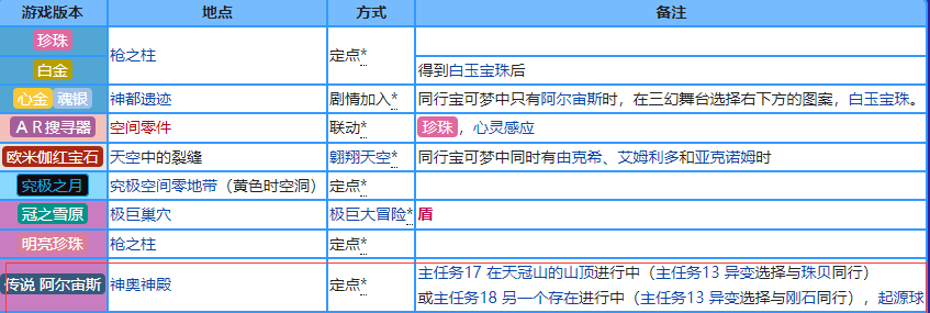 1.在主任務13 異變選擇與珠貝同行則到完成主任務17 在天冠山的山頂進行中時可以在神奧神殿捕捉。或者主任務13 異變選擇與剛石同行則到主任務18 另一個存在進行中時,在神奧神殿可抓取。