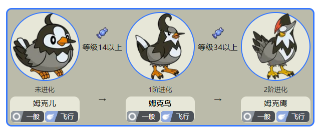 在寶可夢阿爾宙斯中,姆克鳥是一隻一般屬性與飛行屬性的寶可夢,如下圖所示,姆克鳥在等級達到34級以上後,即可成為姆克鷹。