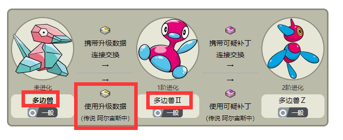 1、在寶可夢阿爾宙斯中,升級數據只能夠用來進化寶可夢【多邊獸】,如下圖所示,當玩家對多邊獸使用【升級數據】以後,即可使其進化成【多邊獸Ⅱ】。