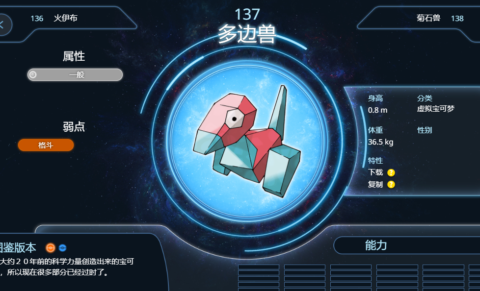 2、多邊獸是一隻一般屬性的寶可夢,弱點是格鬥屬性,特性是下載和復制,自身的特攻值比較優秀。