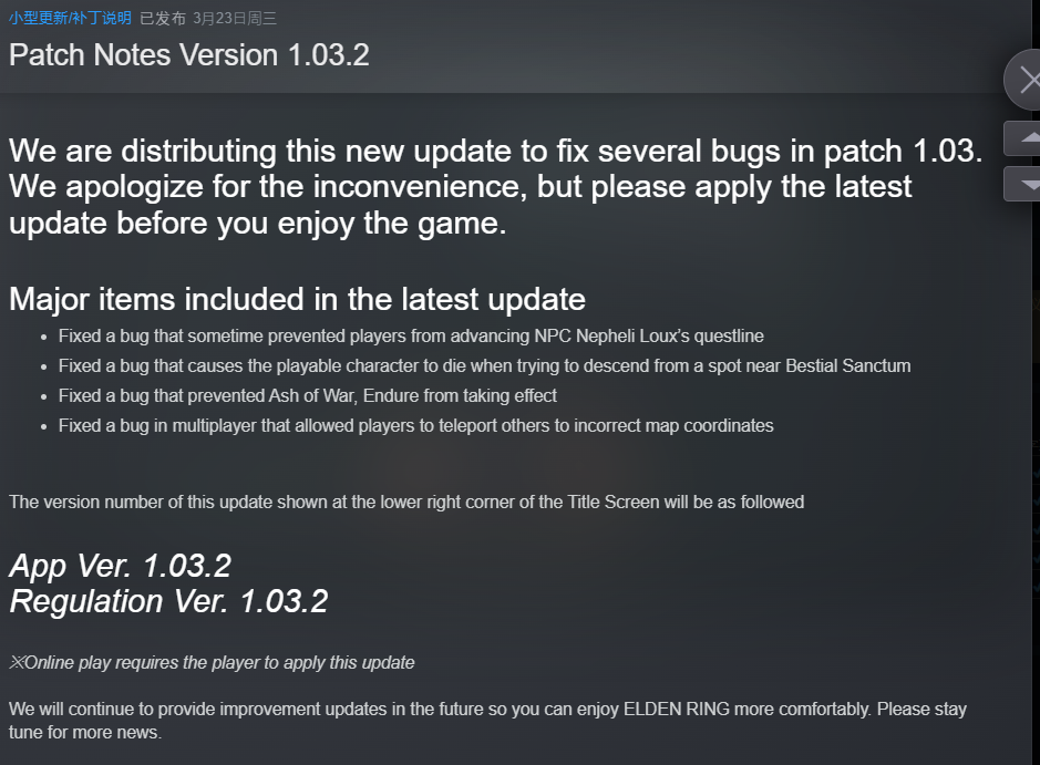 補丁修復幾個1.03版本的錯誤,全平台適用,更新後才能進行多人連線。復女戰士涅斐麗任務線無法進行的錯誤。修復從野獸神殿附近平台下降時可能導致角色死亡的錯誤。修復戰灰:忍耐無法生效的錯誤。修復多人遊戲中允許玩家將其他人傳送到不正確地圖坐標的錯誤。