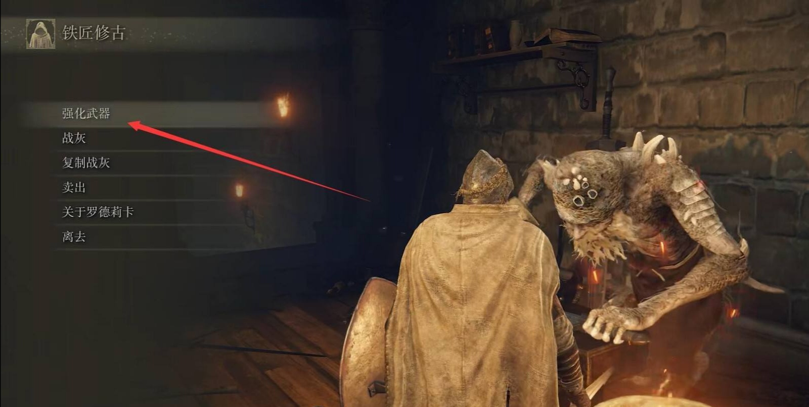 首頁 艾爾登法環 問答 艾爾登法環升級武器在哪? 2022-07-20 1.打開遊戲,選擇點擊傳送到達大賜福位置。2.傳送後即可進入到圓桌廳堂位置。3.隨後進入到右側的房間中。4.進入房間找到一個鐵匠npc。5.選擇點擊與其交談,點擊左側的位置,如下圖所示。