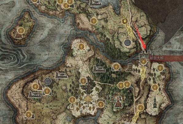 艾爾登法環獻祭大橋的具體位置,可在從亞基爾湖南方,沿著金色光芒的方向一直往南走即可,就可以到達了,可參考如下地圖箭頭的指示。