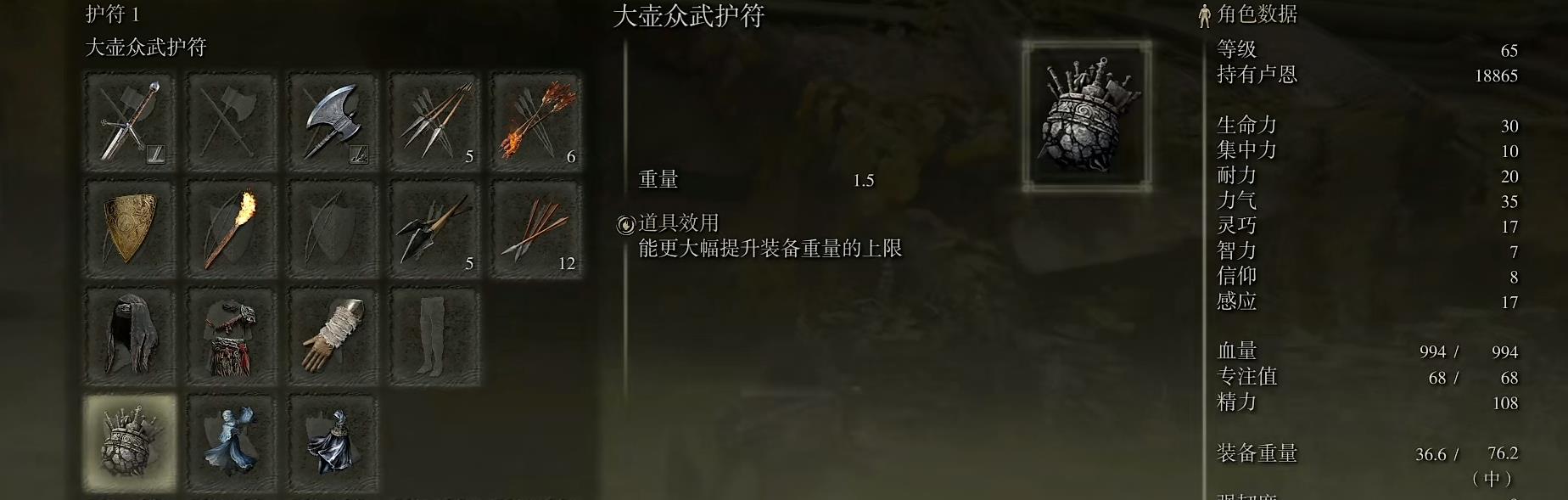 首頁 艾爾登法環 問答 艾爾登法環怎麼加負重? 2022-07-21 艾爾登法環中增加負重的方法主要有以下2種:1.最簡單的方法,就是增加你的耐力值,就是會比較吃資源。2.第二種方法就是佩戴能增加負重的裝備,如下圖所示的護符。