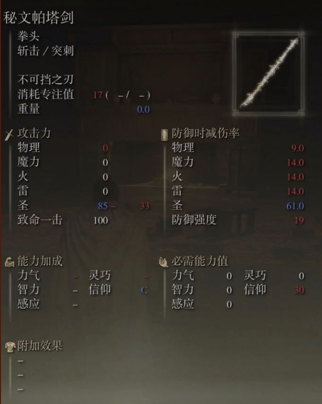 首頁 艾爾登法環 問答 艾爾登法環秘文帕塔劍怎麼樣? 2022-07-21 還不錯,有30信仰這個的傷害很暴力,就是打不出硬直,手短,純信仰加成武器,可以雙持,非常好看,有專用戰技:不可擋之刃,秘文組成的劍刃所發動的攻擊敵人無法阻擋。