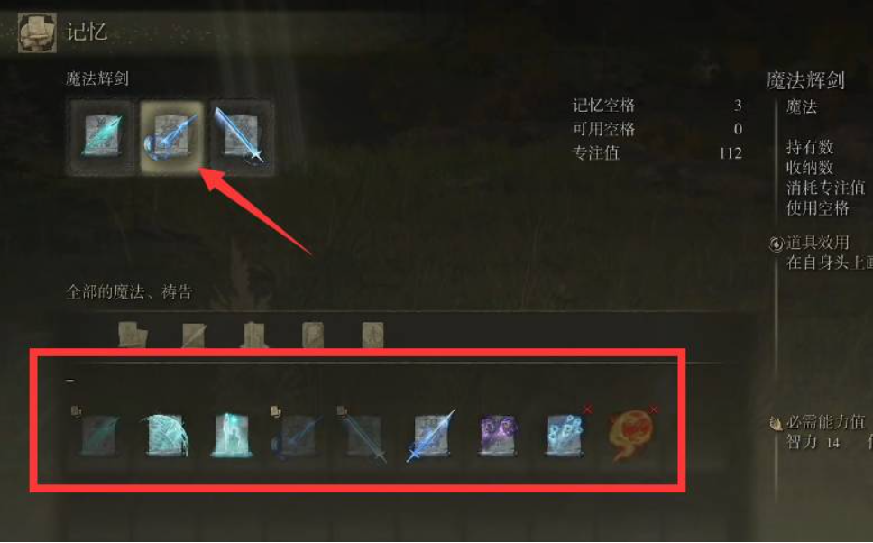 2、將物品欄里需要更換的魔法,拖拽至上方的三個記憶空格里,就可以更換魔法。