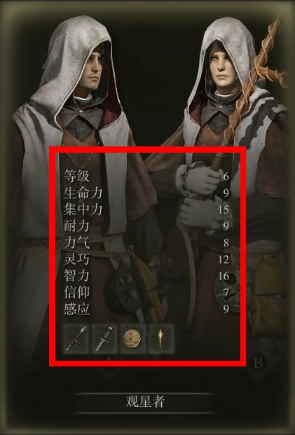 3.觀星者的智力屬性很高,初始武器:觀星杖、短劍、聖句木盾。