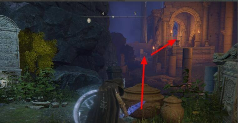 2、激活賜福點【希芙拉河井底】後騎馬沿著道路前進穿過廢墟。