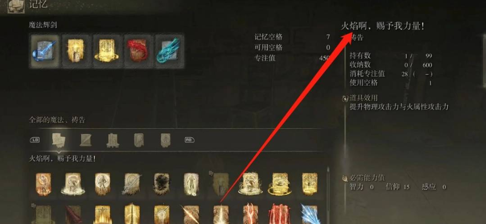 首頁 艾爾登法環 問答 艾爾登法環火焰啊賜予我力量怎麼用? 2022-07-26 1、想要使用火焰啊賜予我力要先去圓桌大廳找【孿生老嫗】,花費800魂買一個【指頭聖印記】,裝備使用它。2、然後玩家需要前往賜福點,選擇【記憶】,然後選擇禱告裝備,火焰啊賜予我力量就可以使用了。