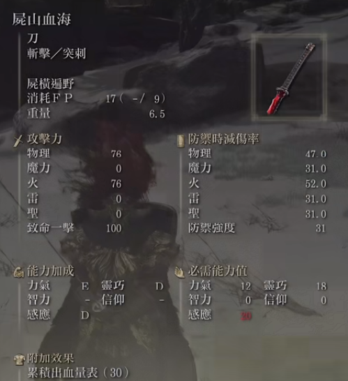 首頁 艾爾登法環 問答 艾爾登法環屍山血海太刀屬性是什麼? 2022-07-26 1、血太刀(屍山血海)武器屬性火,建議血槽厚一點在玩。這把武器需要先決條件,才能任務獲取,挺適合武士一類角色,或者說專為武士打造。武器性能如下圖:2、血太刀位置如下圖所示: